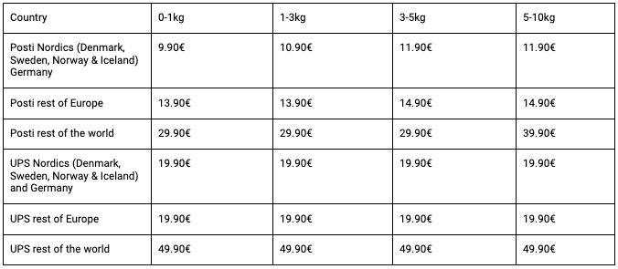 Orders are being shipped during workdays. Products from the stock are usually delivered within 3-5 workdays. Delivery for products that are not in stock usually takes 1-3 weeks. Shipping costs are defined by the selected delivery method, possible extra services, shipment weight and size. The shipping costs can be seen in the check-out functionality before confirming the order and as seen below in the shipping rates tables.